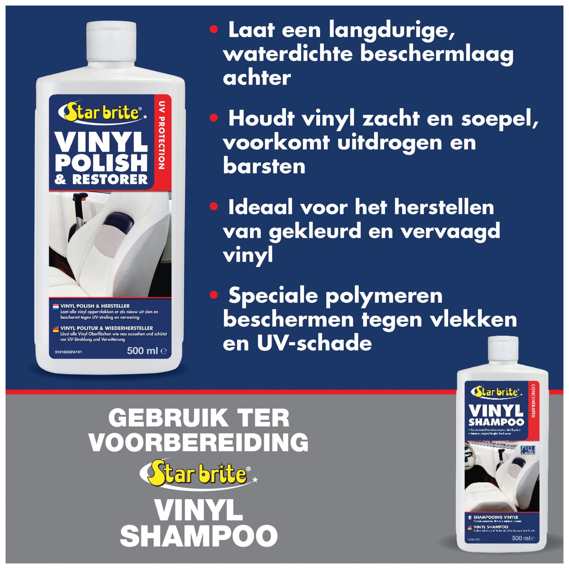 Star brite Vinyl Polish & Hersteller is een handige methode om in één stap zowel nieuw als ouder vinyl er op zijn best uit te laten zien. Breng het simpelweg aan, laat het drogen en poets het uit voor een hoogwaardige waterdichte beschermlaag die beschermt tegen de harde UV-stralen en helpt het vinyl zacht en soepel te houden, allemaal met een aantrekkelijke langdurige glans.